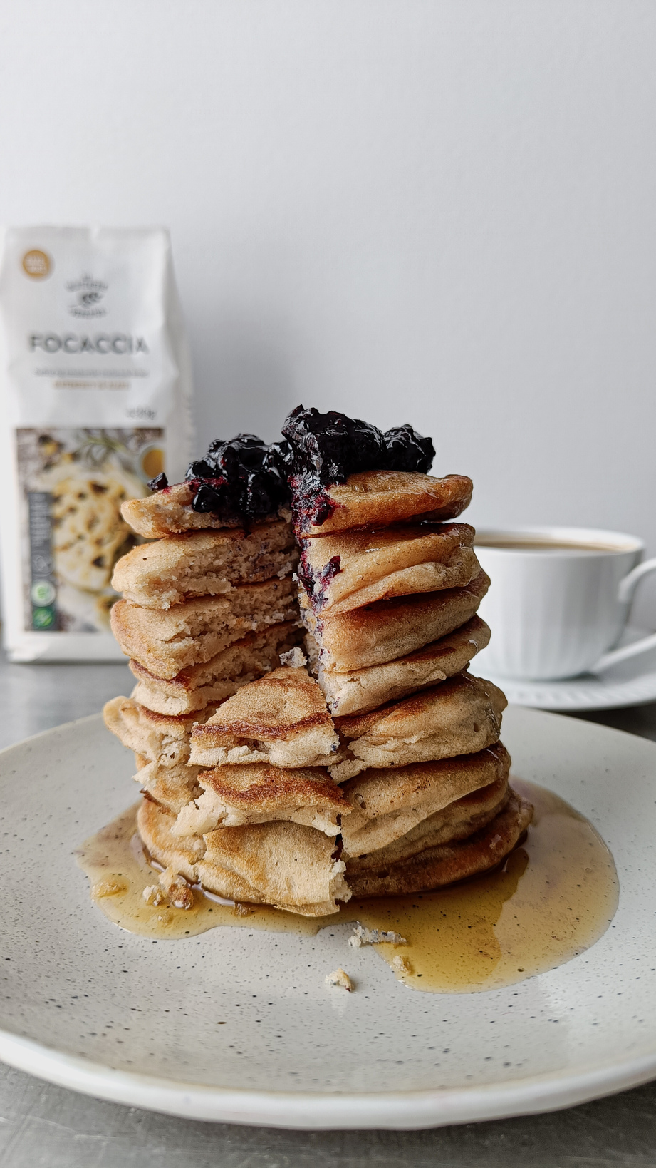 En favoritt til frokost, toppet med rørte blåbær og lønnesirup.