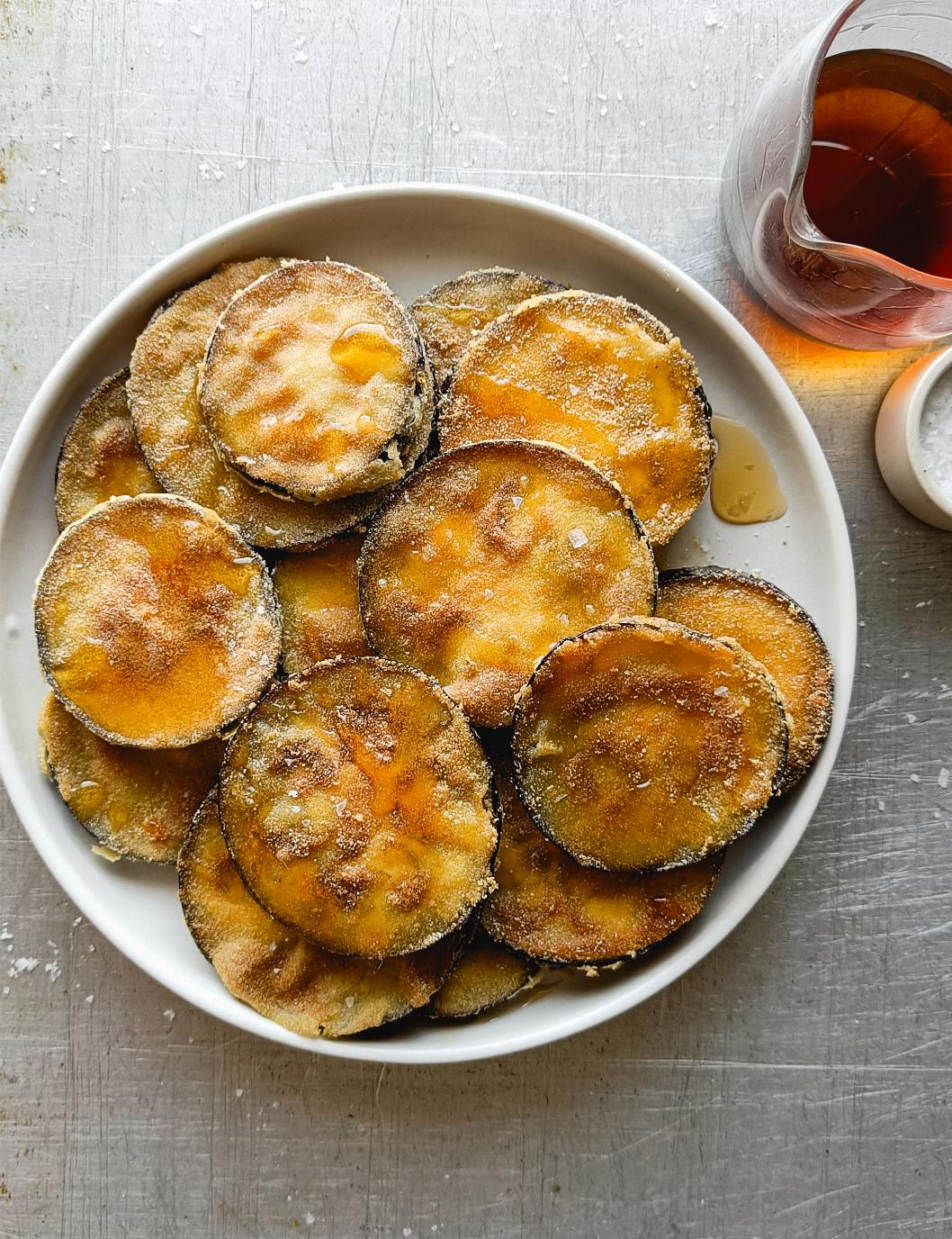 6. Ha auberginskivene over på et serveringsfat, ringle over litt lønnesirup og dryss over flaksalt. God fornøyelse!