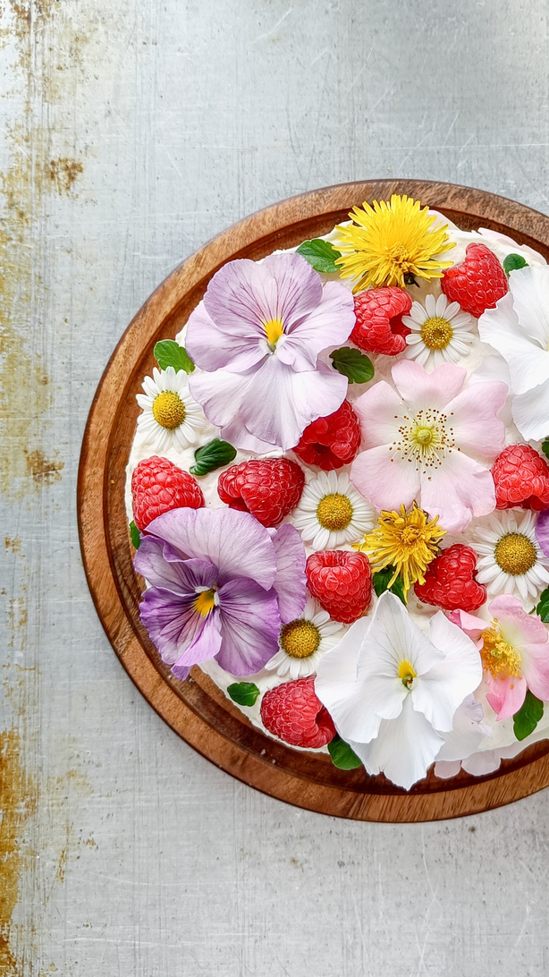 11. Fordel den andre krem blandingen på toppen av og rundt kaken. Pynt med spiselige blomster og friske bringebær. God fornøyelse!