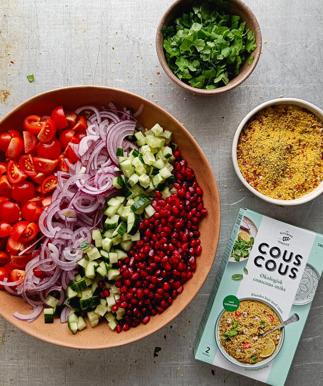 3. Bland rødløk, cherrytomater, agurk og urter sammen med couscous, granateplekjerner og olivenolje i en stor salatbolle. Smak til med sitronsaft, salt og pepper.
