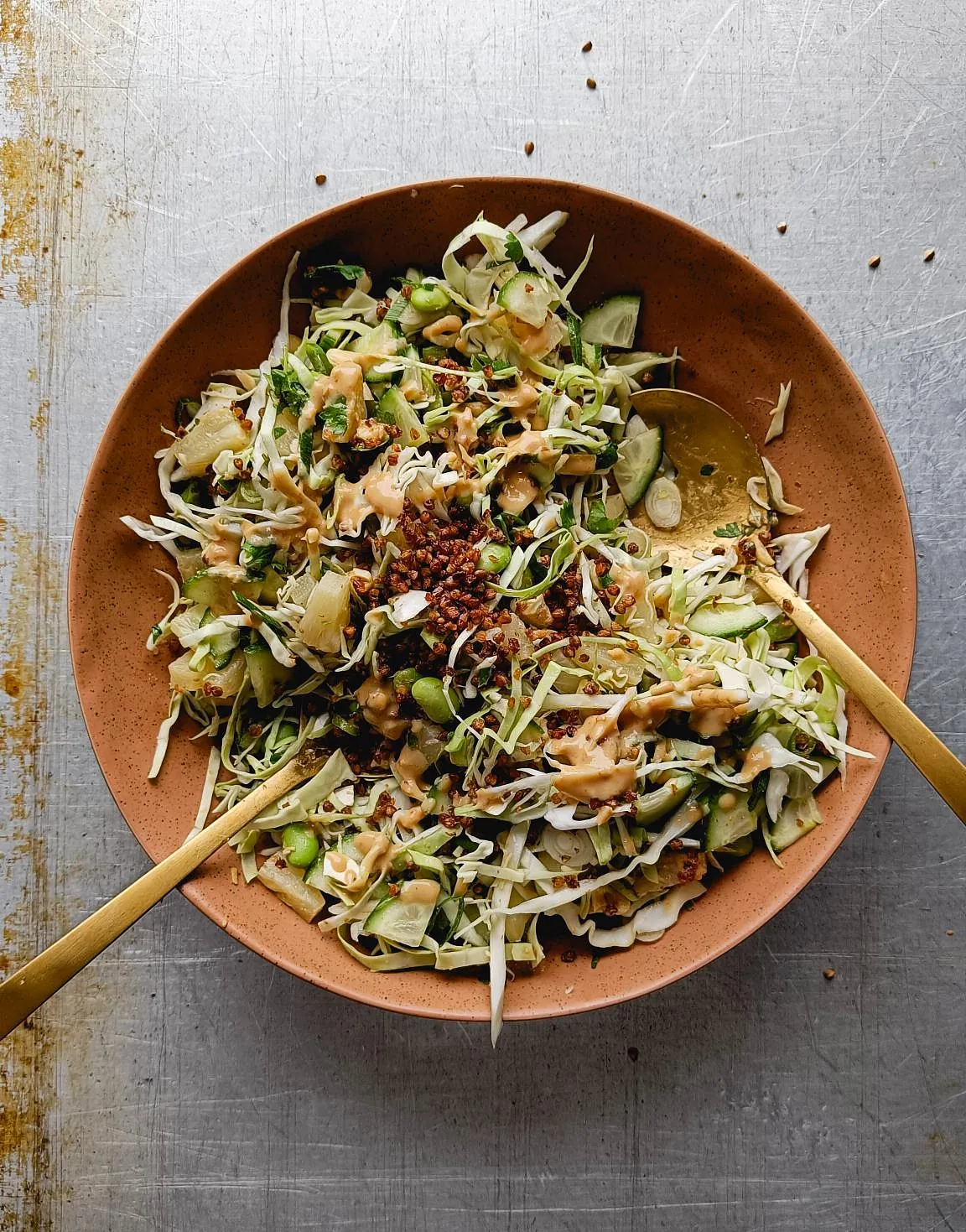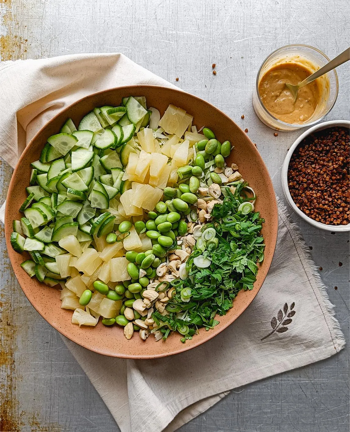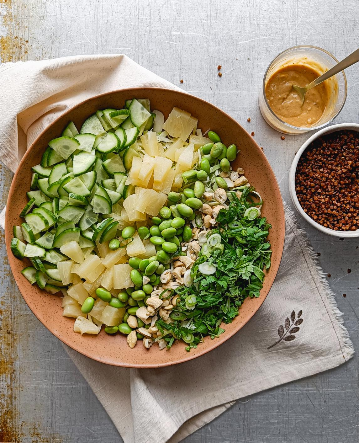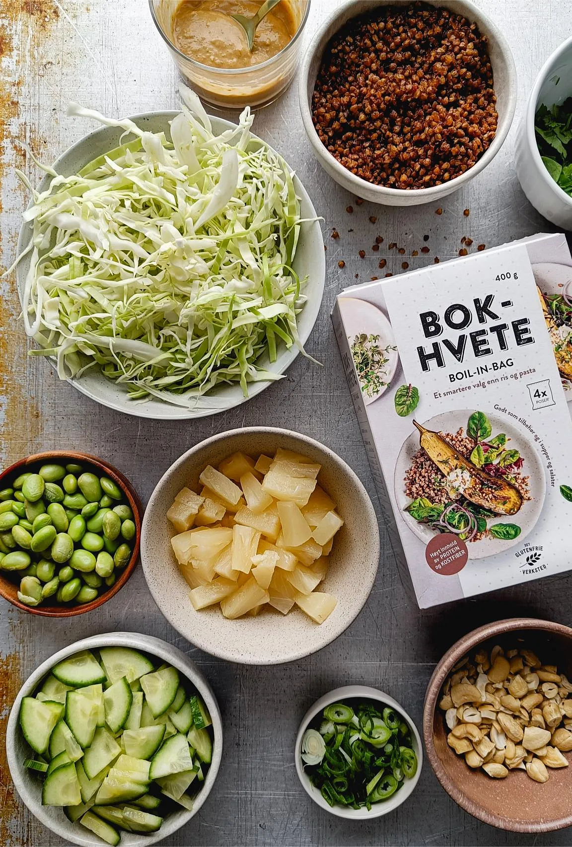 Oppskrift på en nydelig salat med spisskål, edamamebønner, ananas, cashewnøtter og koriander toppet med sprøstekt bokhvete og asiatisk dressing.