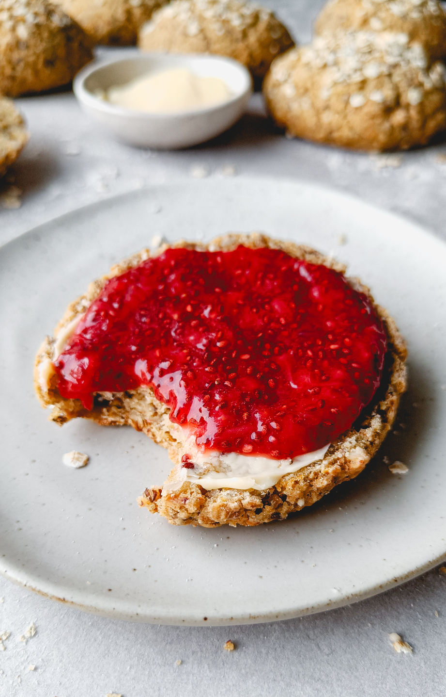 8. Avkjøl rundstykkene lett før du serverer med godt pålegg, og tilbehør som her med nyrørte jordbær