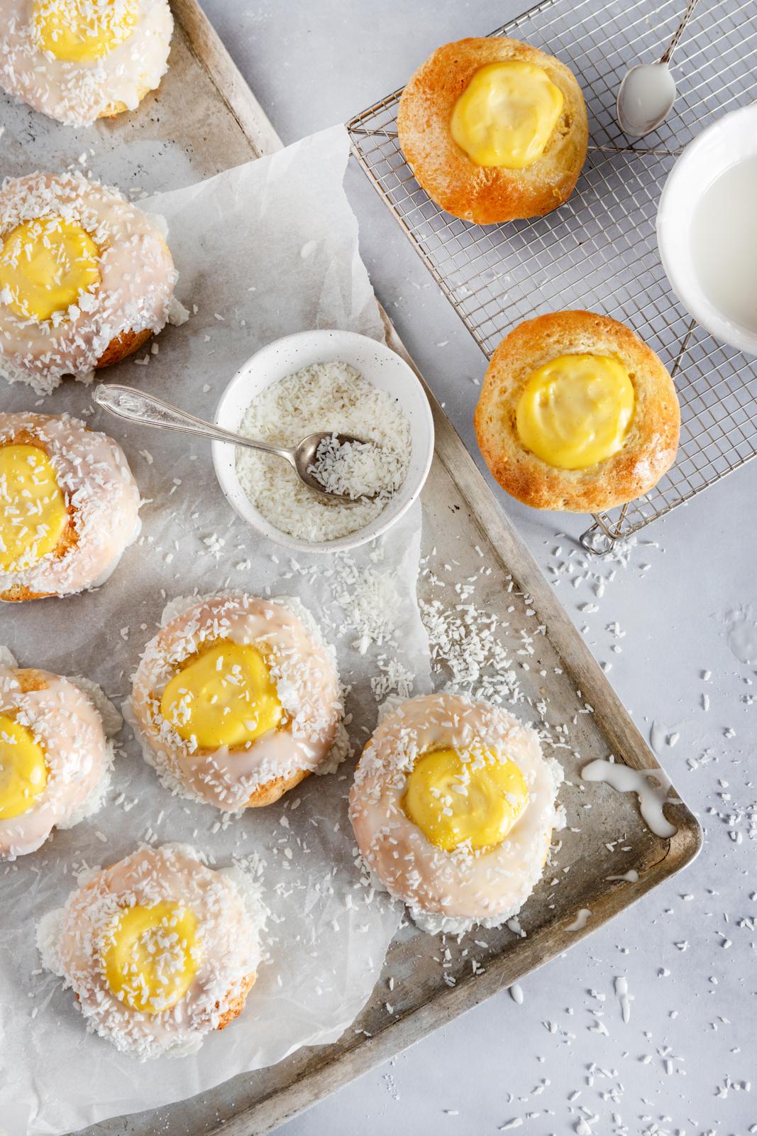 Om du får boller til overs kan det være lurt å fryse ned disse, uten pynt. Bollene tiner fort i romtemperatur, eller du kan gi dem en liten lunk i mikrobølgeovnen eller på varmluft i stekeovnen før du har på melis og kokos.