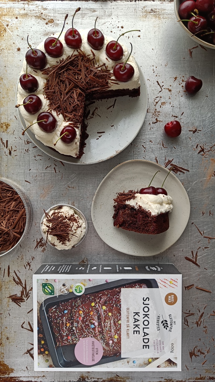 En saftig sjokoladekake med kirsebær og krem, den perfekte kombinasjonen av søtt og syrlig. Dette er en forenklet versjon av klassikeren Schwarzwälder kake, som har røtter i Tyskland. Kaken lages vanligvis av flere lag med sjokoladekake, dynket med kirsebærlikør (kirsch) og fylt med krem og moreller eller kirsebær. Vår versjon er mye enklere å lage, uten alkohol og minst like god!