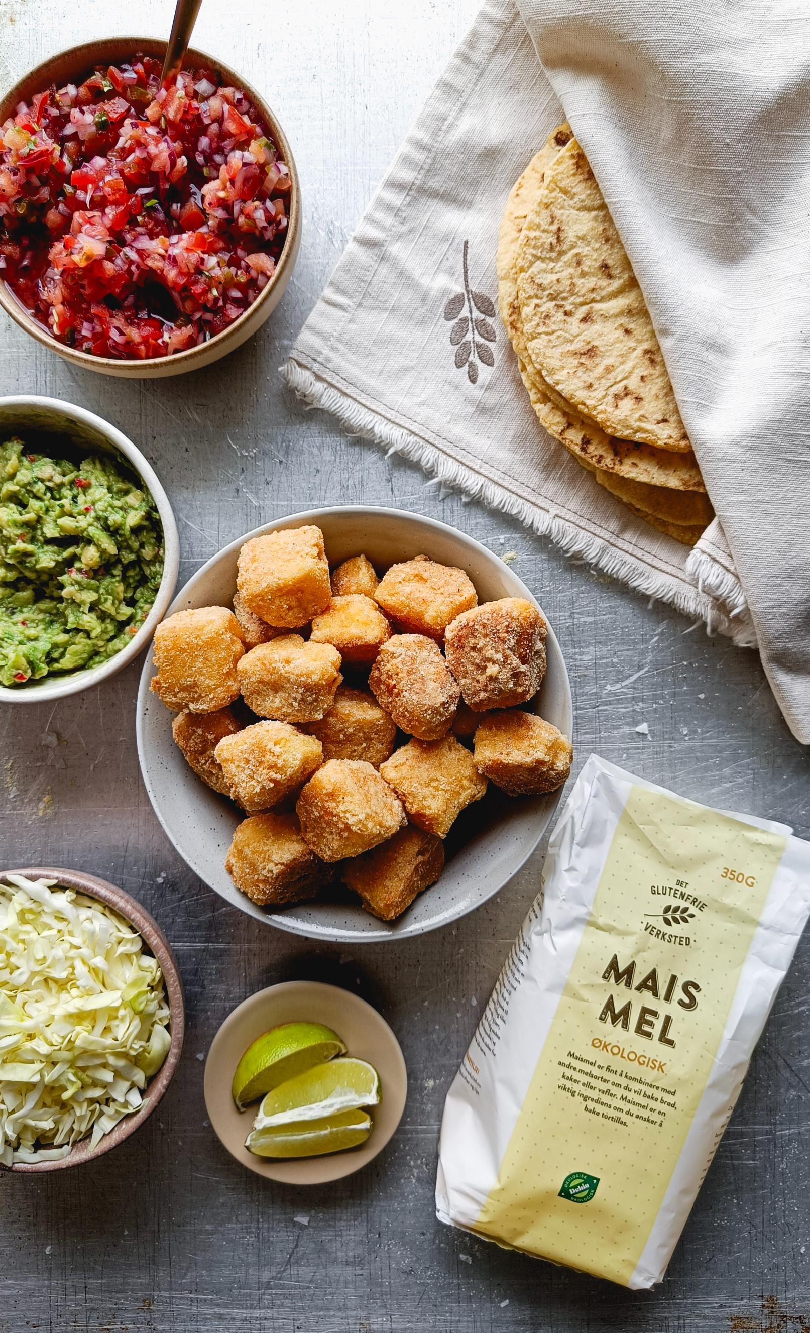 7. Fyll tortillalefsene med panert fisk, salsa, guacamole og ønsket tilbehør. Nyt!