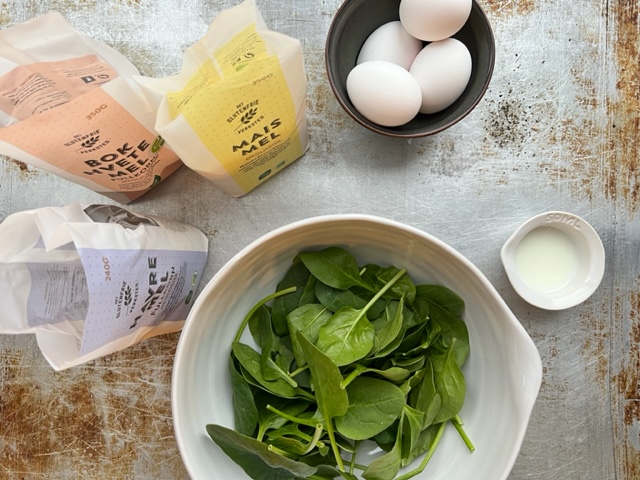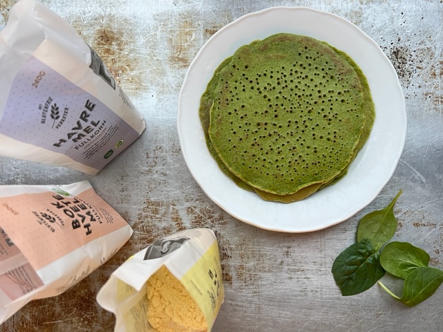 Ha spinat, egg, melk/ plantebasert, olje i en blender og kjør til smooth blanding. Tilsett så bokhvete, havre og maismel pluss litt salt og pepper