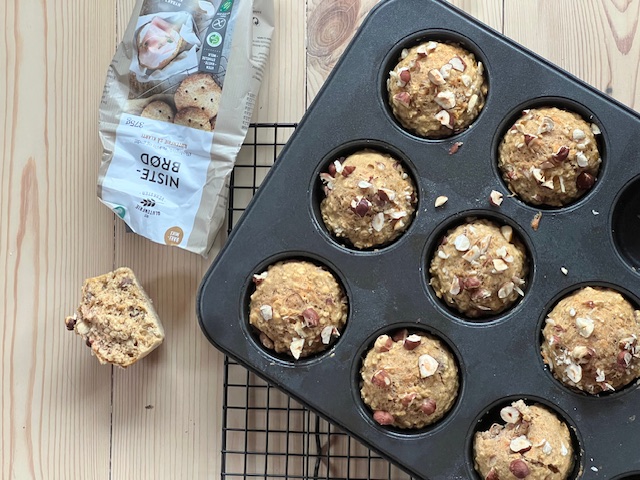 Perfekte muffins bakt på vår egen Nistebrød miks, tilsatt revet gulrot og litt nøtter. Vil du ha de søte tilsetter du bare mere lønnesirup. Perfekt med på tur, i matpakken eller om du bare er litt fysen på noe godt.