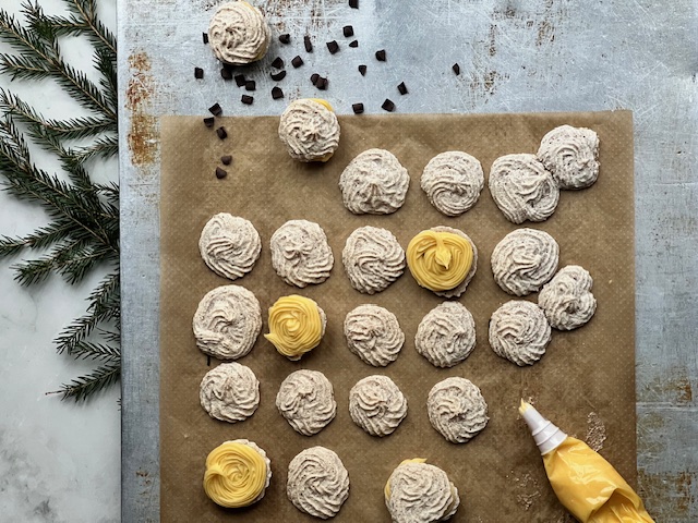 Ha blandingen i en sprøytepose og form 30 runde former på bakebrettet.