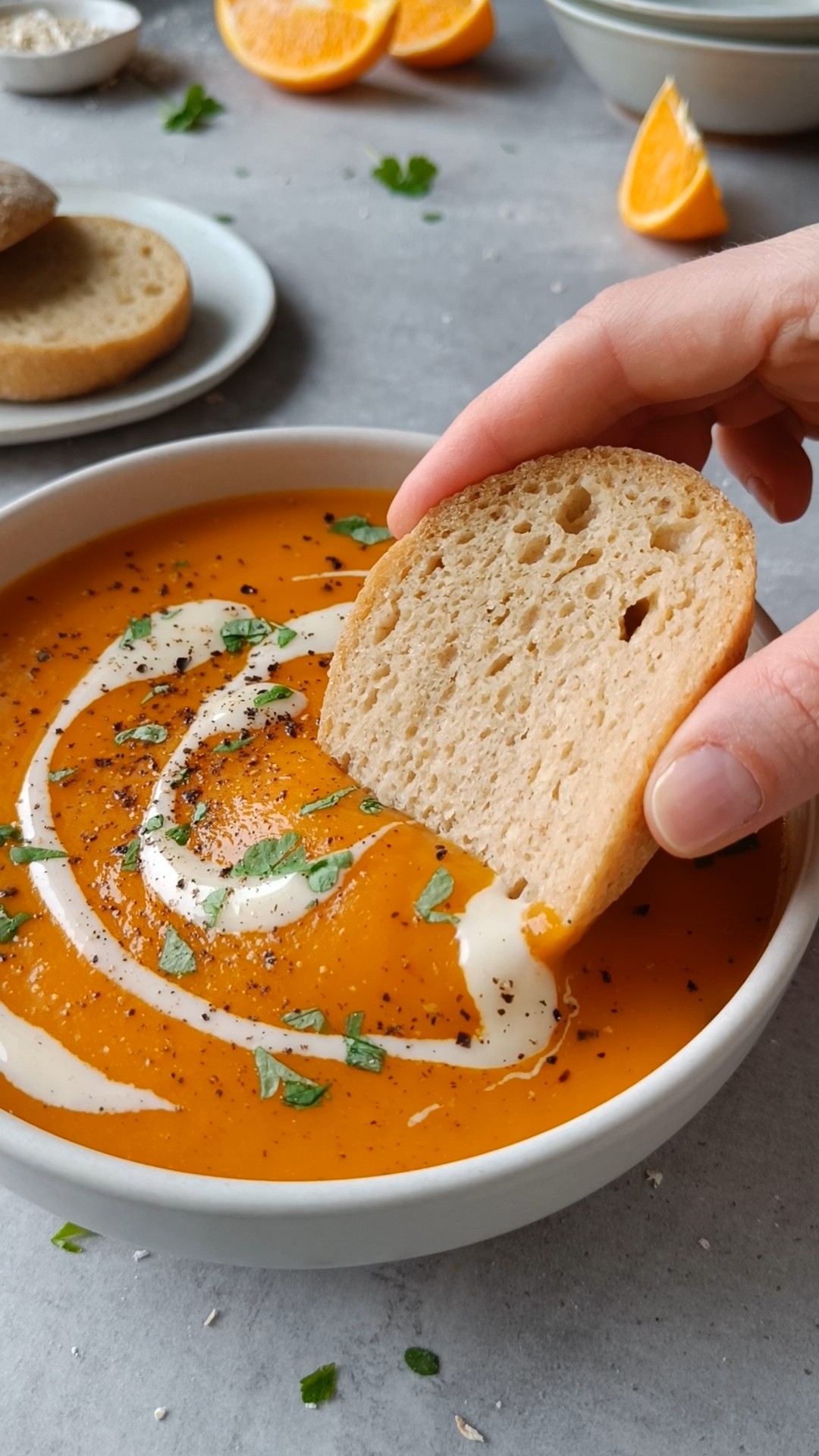 Gulrot og appelsin er nydelig sammen, og denne fargerike suppen er til å bli glad av! En kremet suppe av gode råvarer som er perfekt som en liten forrett eller som hovedrett med rundstykker til.