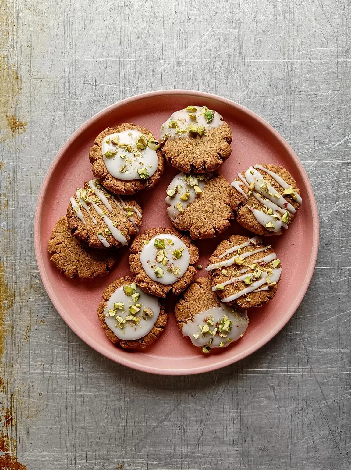 9. Hvis du vil pynte kjeksene blander du sammen melis og sitronsaft til en tykk glasur. Tilsett mer sitronsaft for en tynnere glasur. Pynt de avkjølte kjeksene med melisglasur og dryss over finhakkede pistasjnøtter.