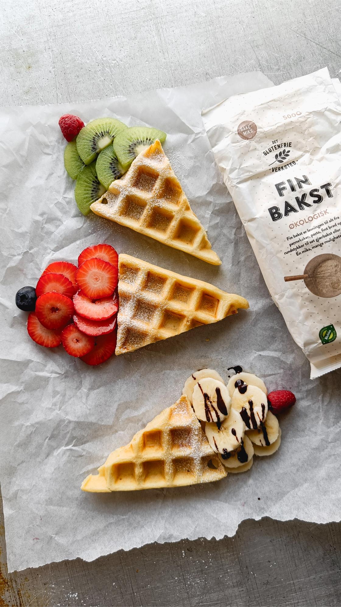 Oppskrift på glutenfrie belgiske vafler. Disse er kjempefine å servere til barna, spesielt når de er pyntet slik at de ser ut som små is. Vi brukte kiwi, jordbær, banan, bringebær og blåbær for å lage morsomme og fargerike “is” 🍦🍓🥝🍌🫐