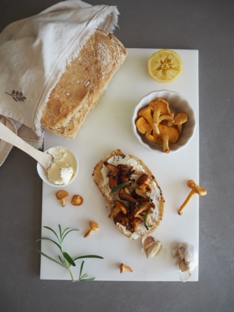 3. Nå har brødskivene rukket å avkjøle seg litt og du kan smøre på snøfrisk og ha over den deilige kantarellblandingen. Dersom du har det tilgjengelig er det godt med litt frisk rosmarin på toppen.