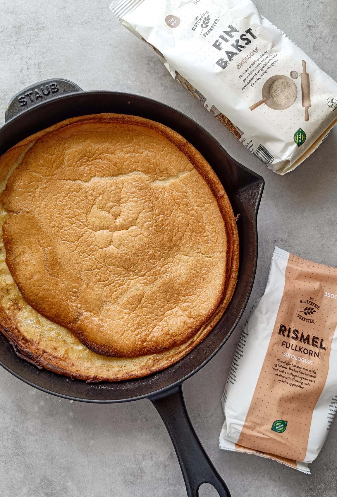 5. Sett stekepannen rett tilbake i ovnen og stek i ca. 20 minutter, til pannekaken er luftig og gyllenbrun. Det er viktig å ikke åpne ovnsdøren under stekingen!
