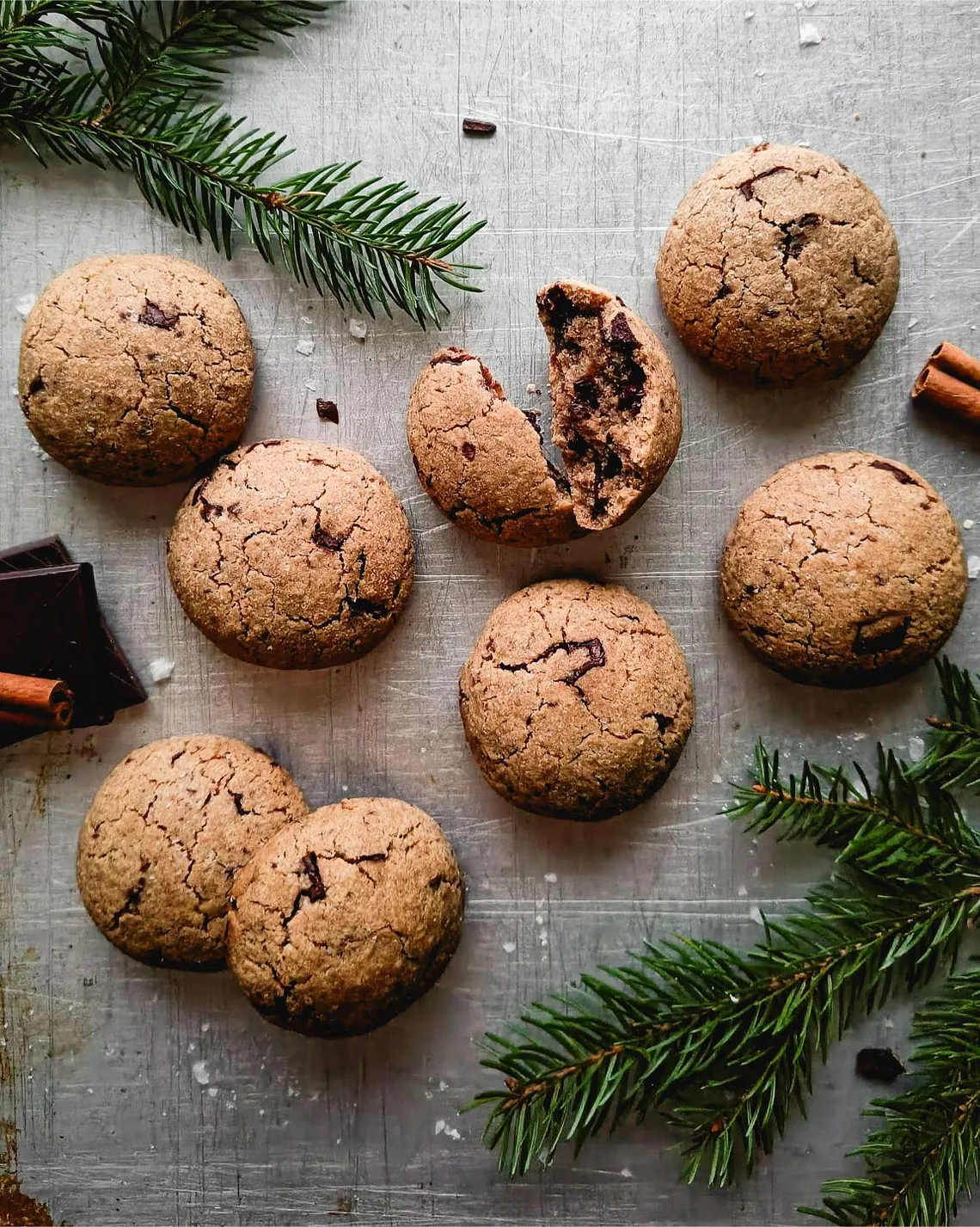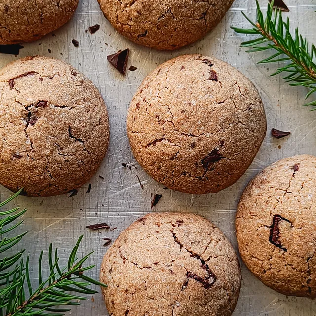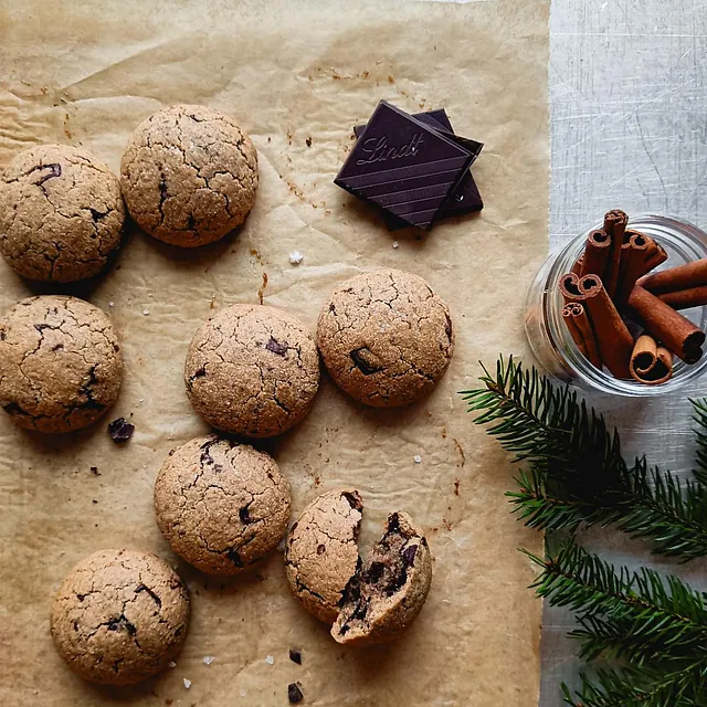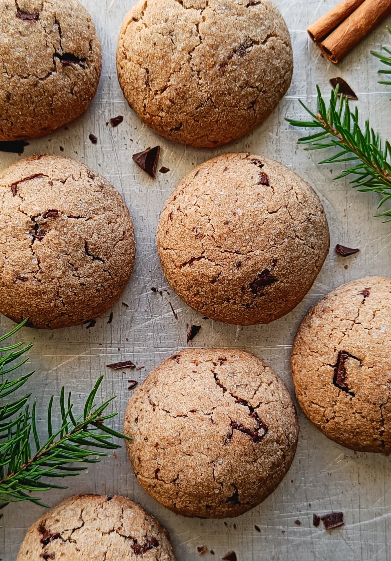 Oppskrift på julecookies med pepperkakekrydder og mørk sjokolade som vil falle i smak hos store og små. Kombinasjonen av varme julekrydder og sjokolade er helt nydelig! Denne oppskriften gir ca. 16 cookies.