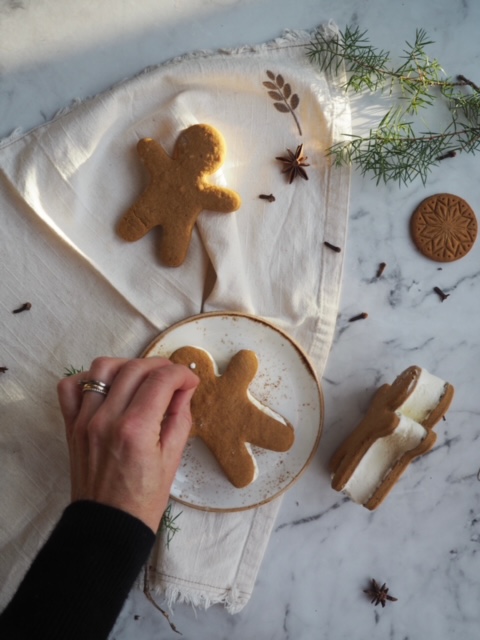 La vaniljeisen stå en stund på kjøkkenbenken til den blir litt myk. Ta den ut av emballasjen og del den opp i tykke skiver som du så trykker ut kakemann/ kone formen i. Legg/ skyv så vaniljeisen over på en kake og legg en ny på toppen. På den måten får du en morsom pepperkake sandwich som kan by på litt utfordringer når den skal spises, men jeg lover deg at kombinasjonen pepperkake og vaniljeis er ganske så yummi yummi :)