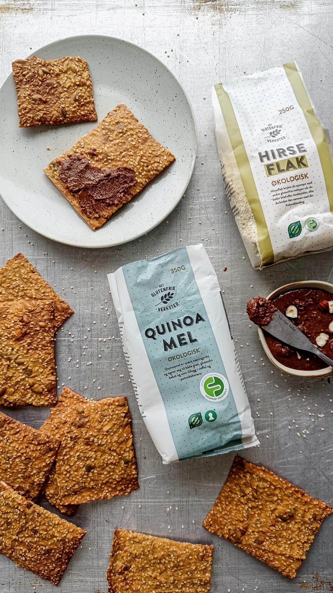 Knasende gode glutenfrie knekkebrød med quinoamel, hirseflak og masse frø. Quinoa er svært næringsrikt og er en fin kilde til både kostfiber og protein. Hirse er en av de eldste kornsortene, og har et høyt innhold av proteiner og er rik på mineraler.