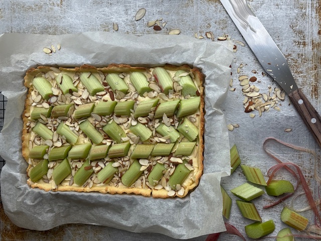 Nå er det høysesong for rabarbra og da kan det vel friste med en deilig pai fylt med vaniljekrem og syrlig rabarbra?
