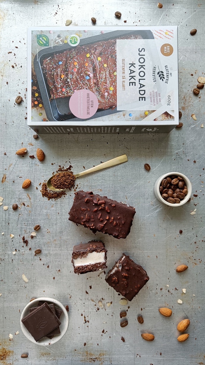 *Vi brukte en form på 37x25 cm til å lage kaken og en på 18x18 cm til å lage isen. Du kan også lage to like store kakebunner og bruke samme form til å lage isen. I så fall må du ha mer iskrem og sjokoladetrekk.
