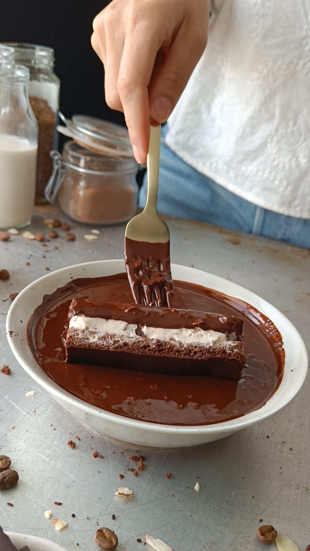 3. Bland sjokoladekakemiksen, natron og kaffe i en bakebolle. Tilsett eplemos, smeltet kokosolje og “kjernemelk” og visp til du har en jevn røre. Ha i kokende vann og rør raskt sammen.
