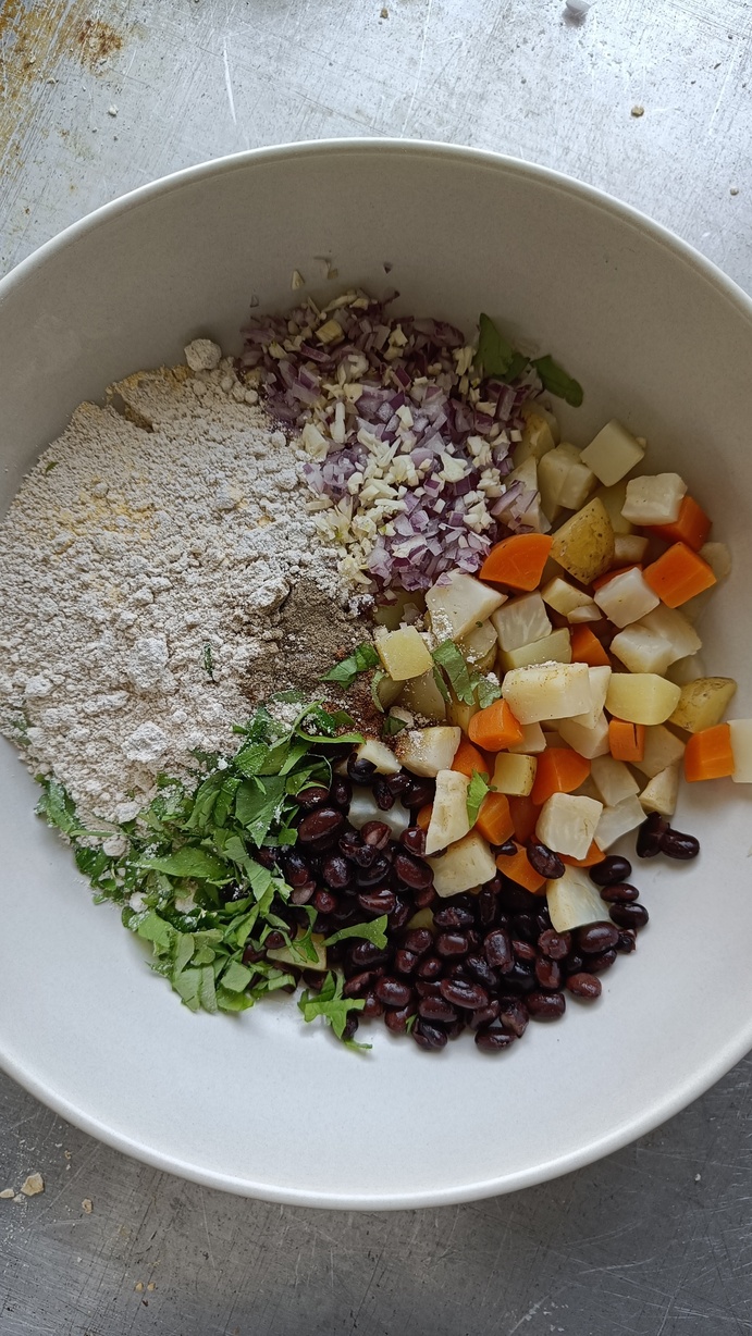 2. Ha sorte bønner og de kokte grønnsakene i en stor bakebolle og bruk en gaffel til å mose dem. Tilsett resten av ingrediensene og bland det hele godt sammen til du har en fin sammenhengende farse. Farsen skal være litt klissete, men grei å jobbe med. Mos litt mer med gaffel hvis det er for mye store biter.