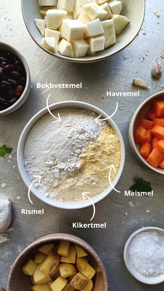 Saftige og smakfulle selleriburgere eller “falafel” med sellerirot, sorte bønner, gulrot, potet og fem glutenfrie melsorter. Glutenfrie melsorter er ofte best i kombinasjon med andre glutenfrie melsorter for best mulig smak og konsistens. Her er det mye fiber og proteiner, slik at disse holder deg mett lenge.