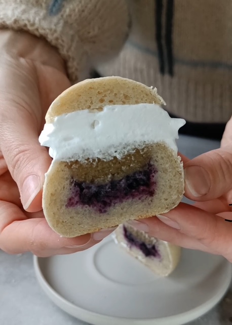 6. Skjær av et lokk på hver av bollene. Grav forsiktig ut innmat med en skje. Fyll hullene i bollene med bjørnebær og mandelfyll. Før servering toppes bollene med pisket kokoskrem og lokket legges på.