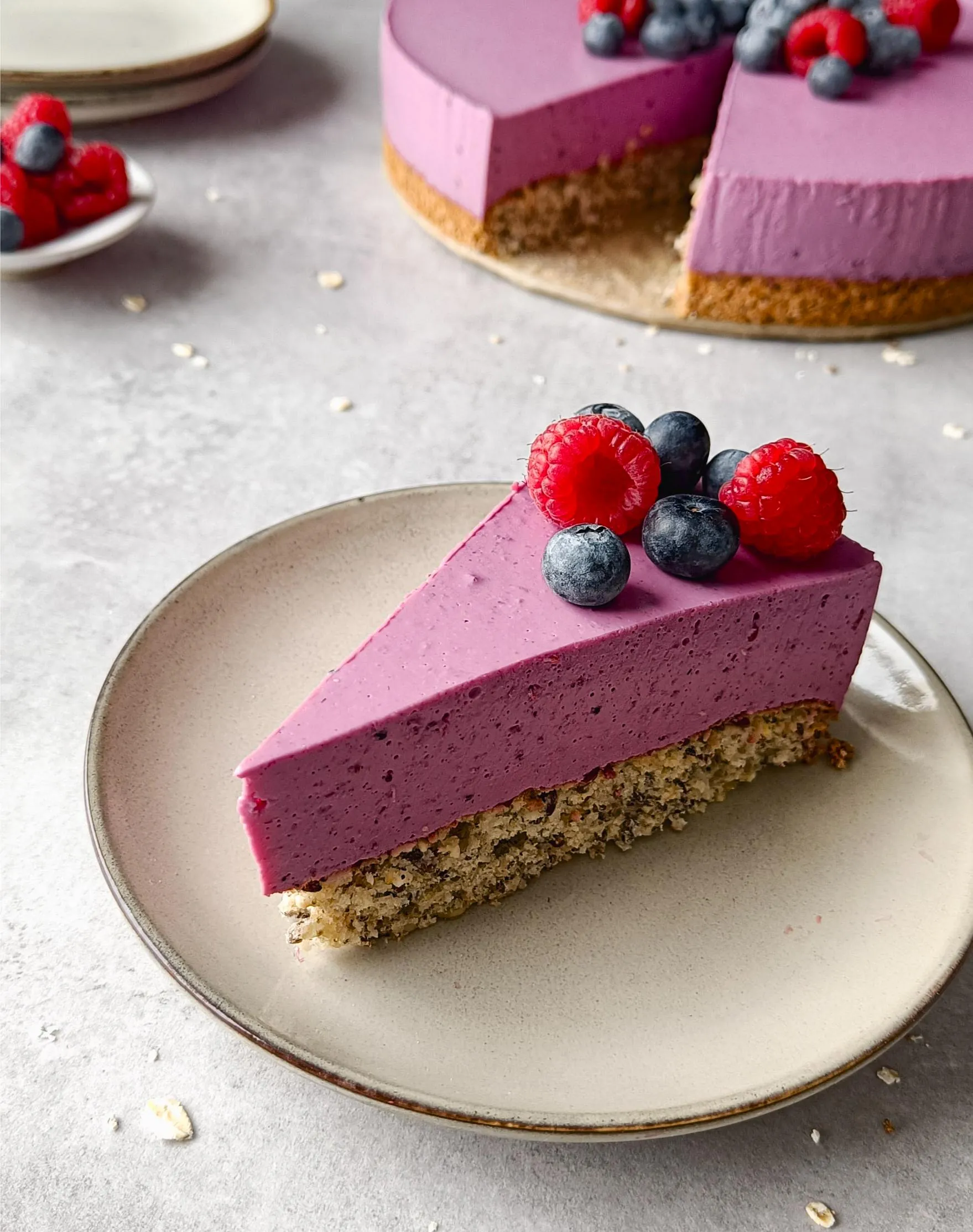 6. Sett formen i kjøleskapet til dagen etter (eller i minst 5 timer) så fromasjen får stivnet helt. Ta kaken ut av kjøleskapet og fjern kakeringen. Pynt med friske bær om ønskelig og server.