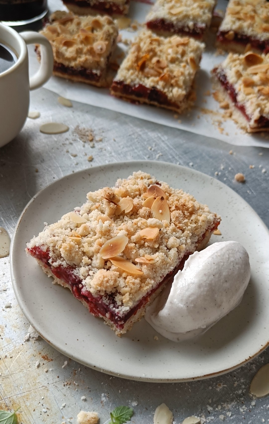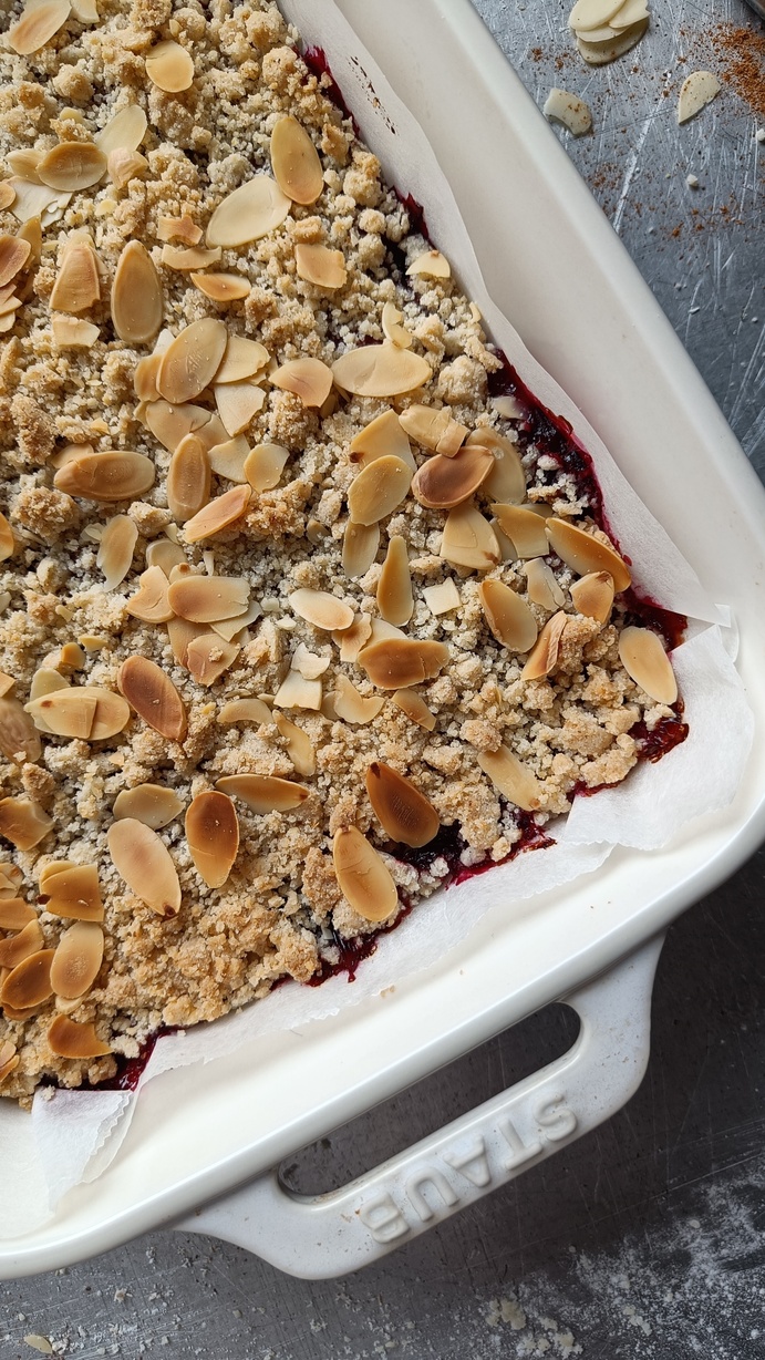 7. Smuldre den gjenstående ⅓ del av deigen (165 g) på toppen. Strø eventuelt en neve mandelflak over smuldredeigen.
