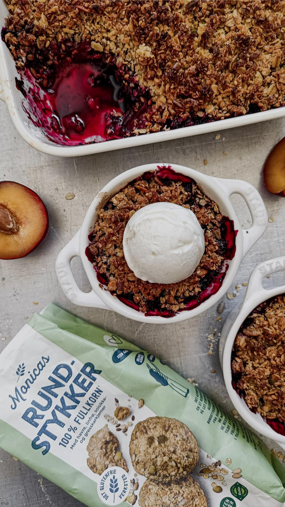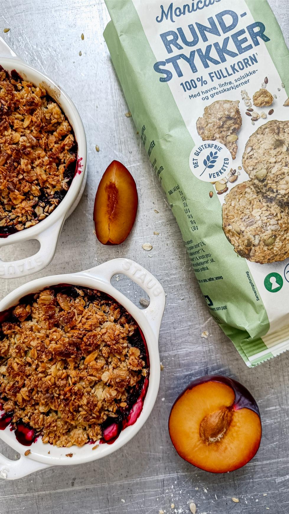 Utgangspunktet for denne desserten er plommer og blåbær som toppes med en smuldredeig laget av vår Rundstykke miks.Fantastisk godt og faktisk litt sunnere!