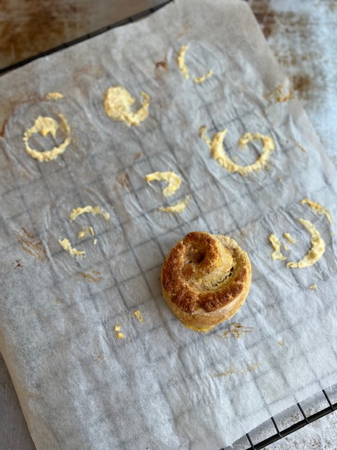 Bruk en pizzaskjærer og del opp i like tykke remser - vi fikk 9 stk. Rull så sammen og sett på stekbrett dekket med bakepapir.