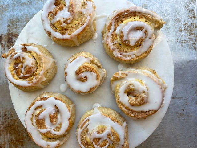 Forvarm ovnen til 200°C. Pensle bollene forsiktig med sammenvispet egg (1 ss melk + 1 ts lønnesirup for eggfri), dryss på kanel og stek i 20-25 min til gyllen.