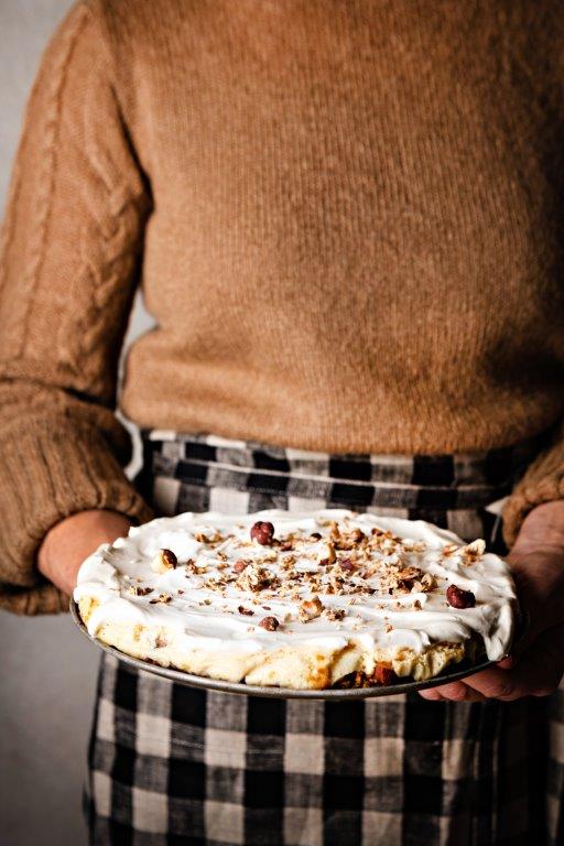 Smør så creme fraiche utover kaken. Like før servering strør du over hakkede nøtter.