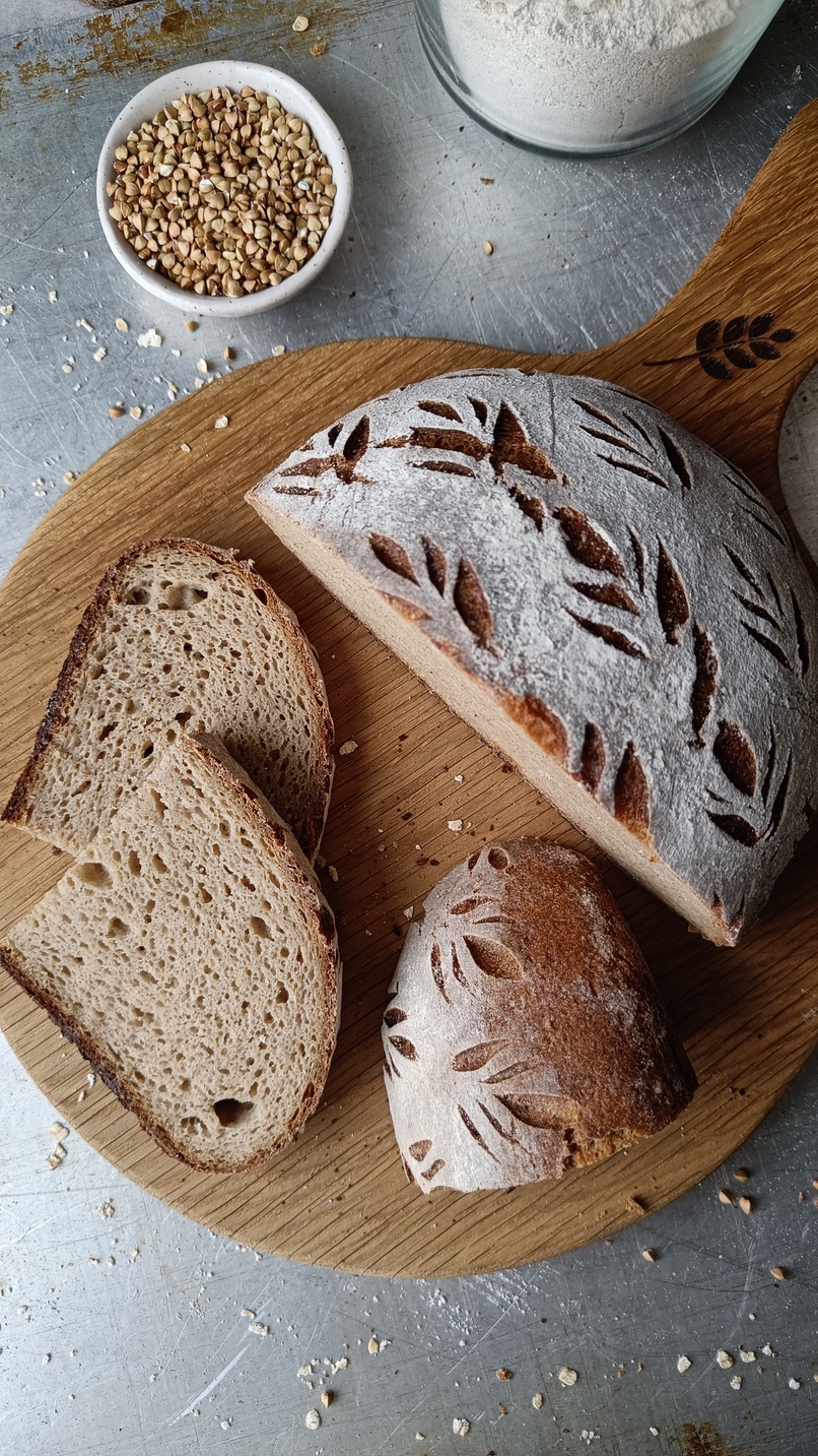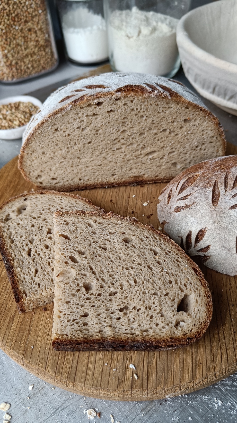 2. Tilsett så 60 gram fullkorn rismel, 30 g bokhvetemel og 30 g havremel. La blandingen stå i varm romtemperatur i 6-8 timer, eller til den bobler og har hevet 70-100%, før du blander den inn i deigen.
