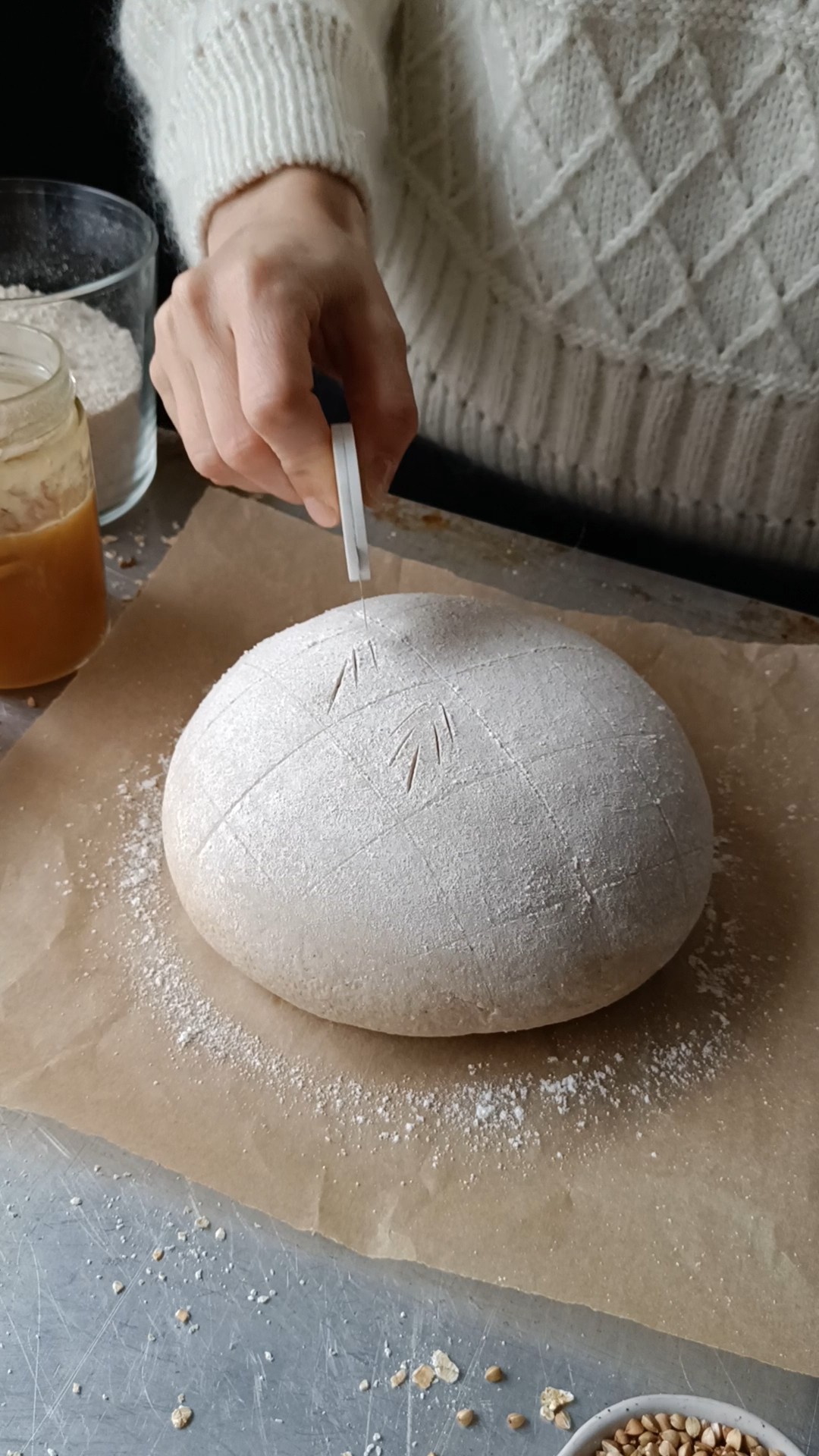 7. Legg den ferdighevede deigen forsiktig på et stykke bakepapir og lag mønster som ønsket. Bruk sytråd til å markere streker og et barberblad til å lage kutt. Du bør kutte ca 6-10 mm dypt. Ved å lage kutt i deigen kontrollerer du hvor brødet sprekker.