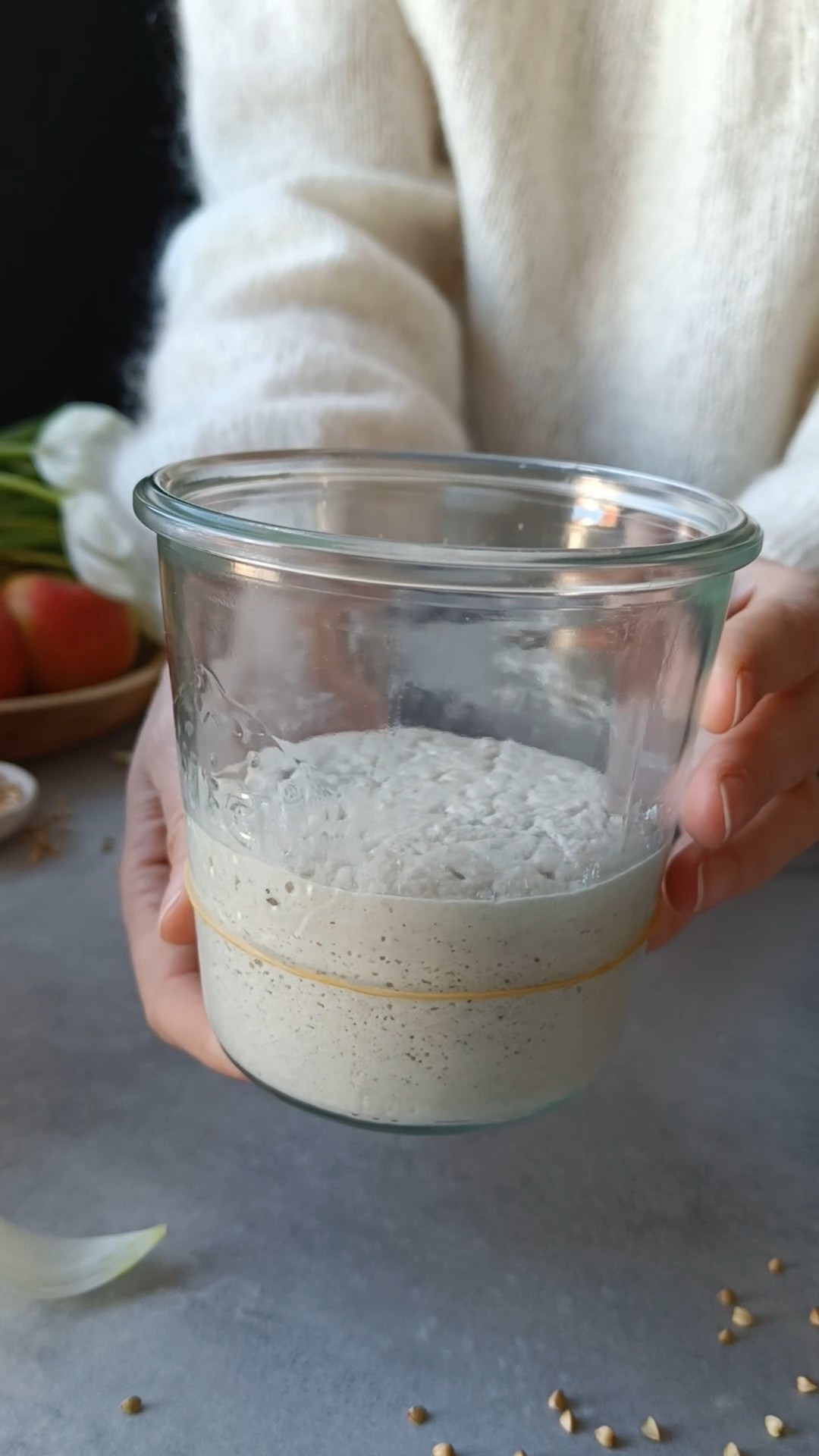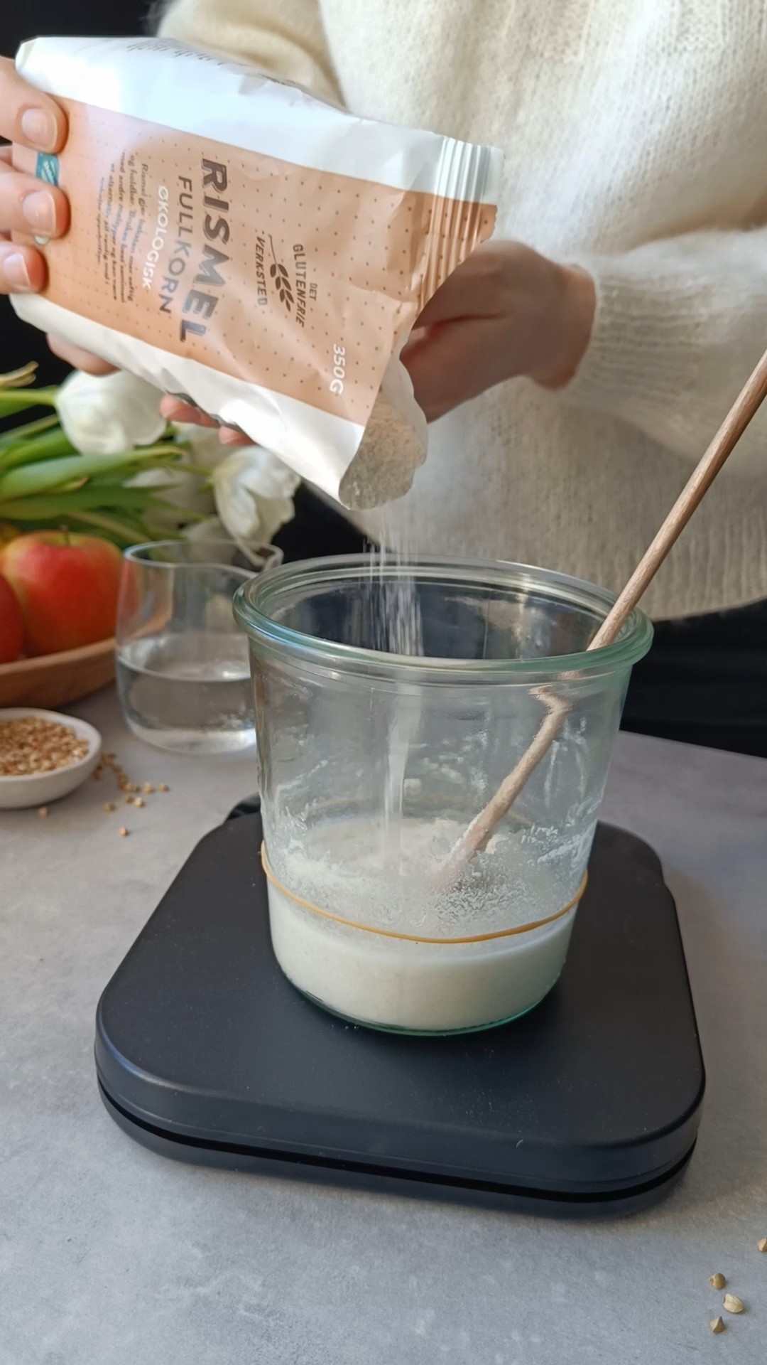 Morgenen: Rør godt i starteren og overfør 50 g til et nytt glass. Tilsett 40 g vann, 30 g bokhvetemel og 30 g fullkorn rismel. Rør godt til blandingen er helt uten melklumper. Skrap starteren ned fra kantene. Legg lokket løst på og la glasset stå i romtemperatur.