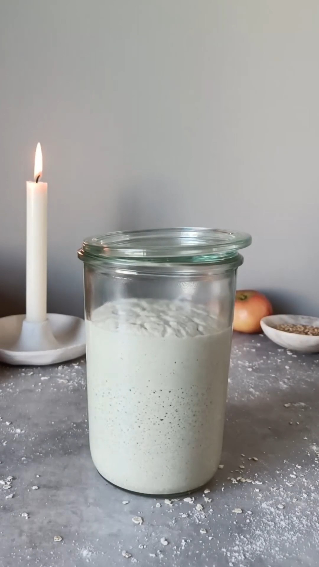 - Tilsett skallet til 1/4 eple. Det bidrar til en raskere fermentering fordi epler har en høy andel villgjær på skallet. Skrap starteren ned fra kantene. Legg lokket løst på og la glasset stå i romtemperatur i 24 timer. Sett gjerne en gummistrikk rundt glasset så du kan følge med på hvor mye starteren vokser.