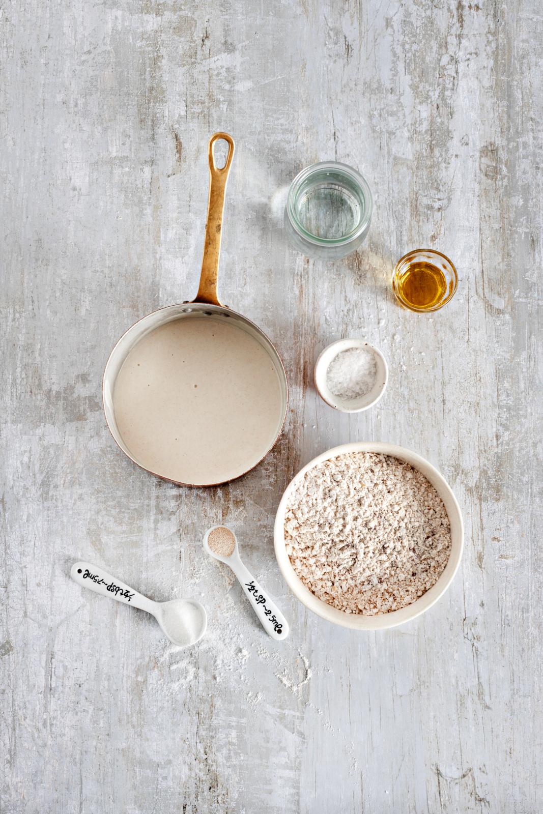 - Bland så mel, tørrgjær, sukker, brødkrydder (kan utelates) og vann i en bakebolle og tilsett jevningen