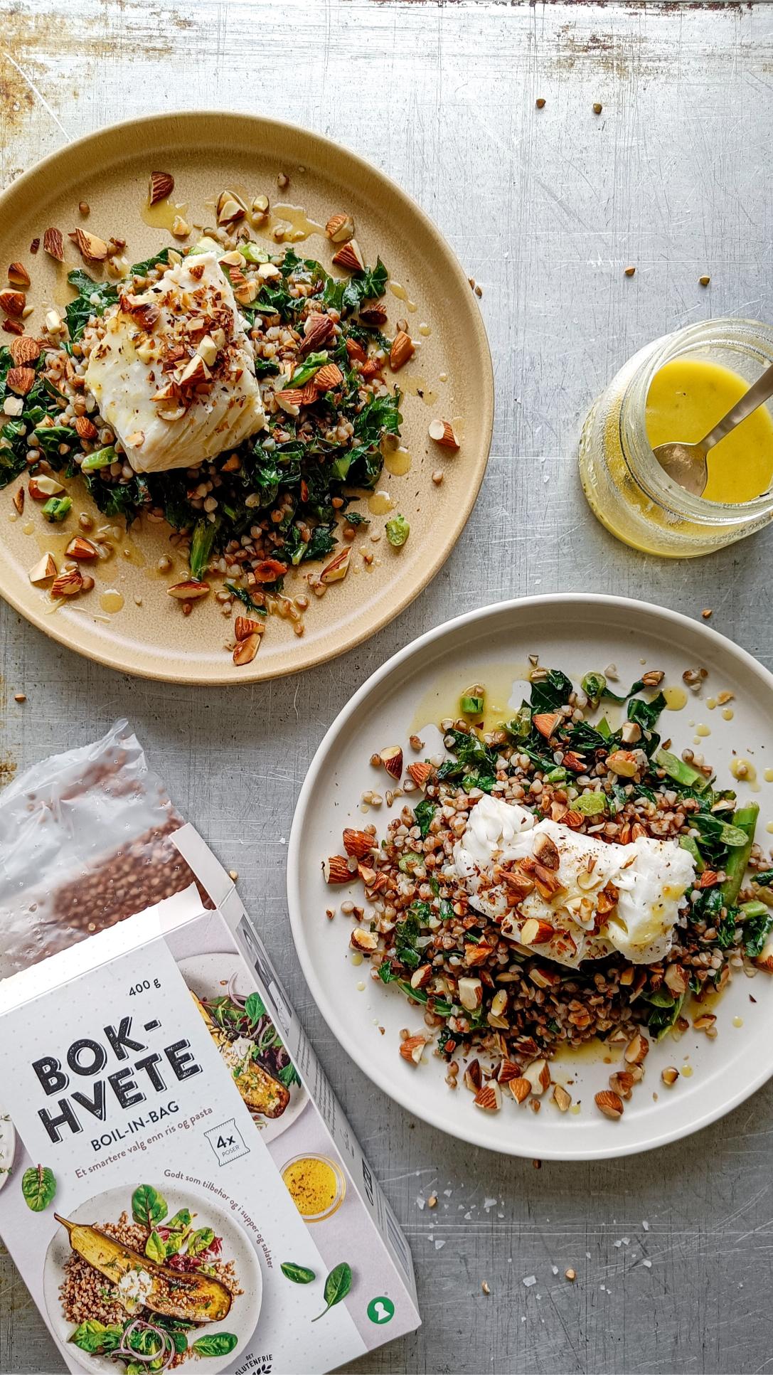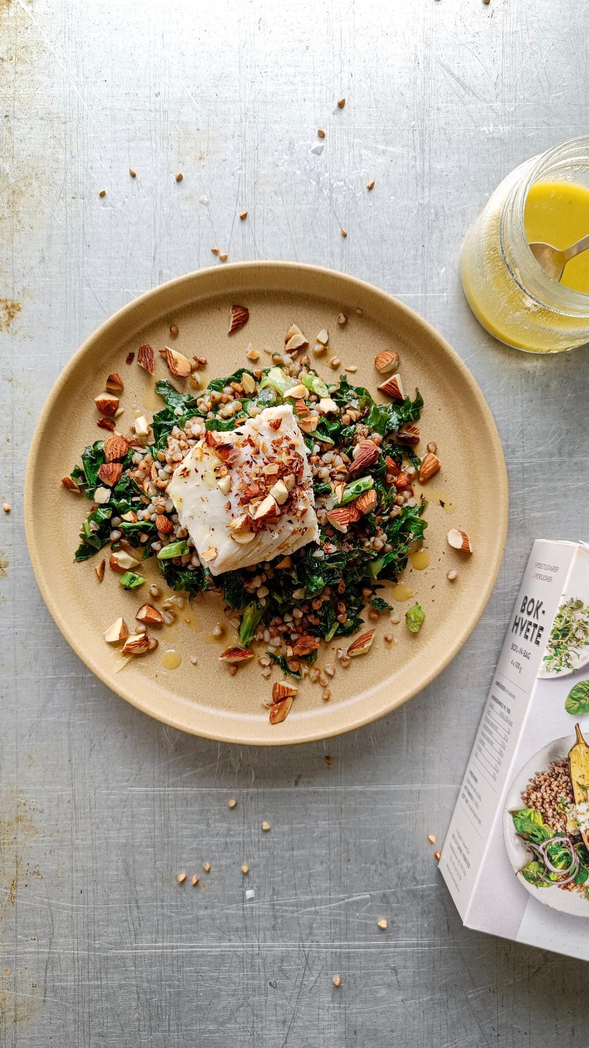 Torsk på seng av grønnkål og bokhvete, toppet med ristede mandler og en smakfull vinaigrette.
