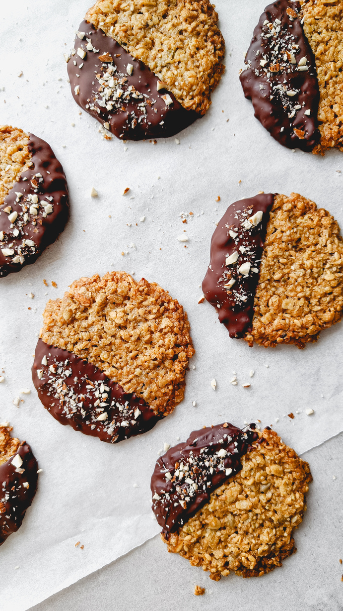 6. Smelt sjokoladen i vannbad. Når kjeksene er helt avkjølt, dypper du halve kjeksen i sjokoladen og strør på hakkede nøtter. Velg den sjokoladen og de nøttene du liker best. Legg kjeksene på et bakeark til sjokoladen har stivnet. Oppbevares i en tett kakeboks. Nyt!