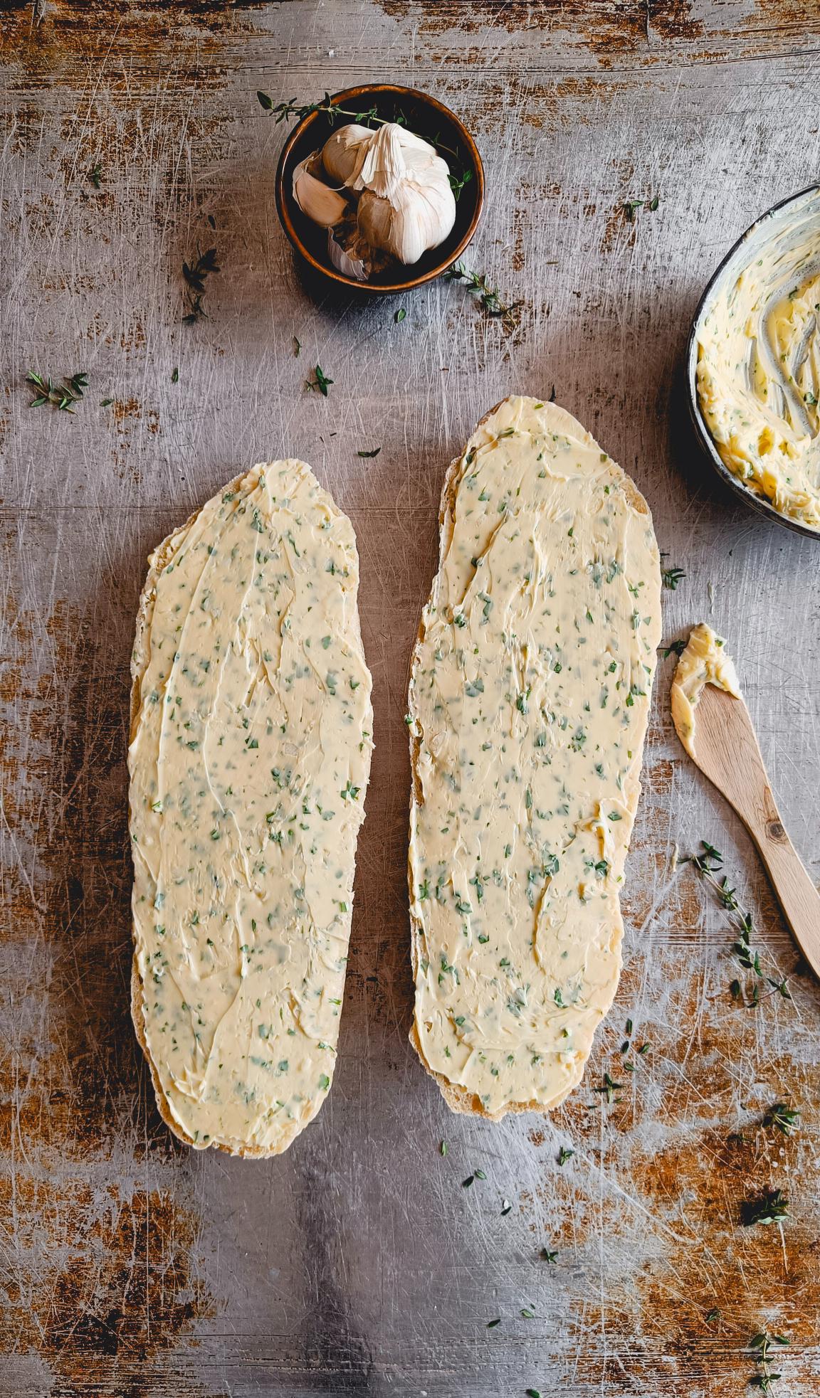 3. Bland ingrediensene til hvitløkssmøret i en bolle. Fordel jevnt utover baguettene. Stek i 10-15 min.