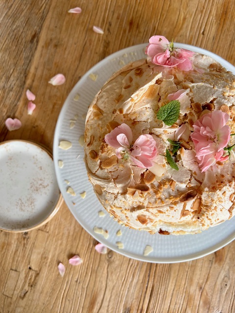 Fordel så marengsen over kakedeigen og lag litt bølger og struktur ved hjelp av slikkepotten. Tilslutt strør du mandelskiver over.